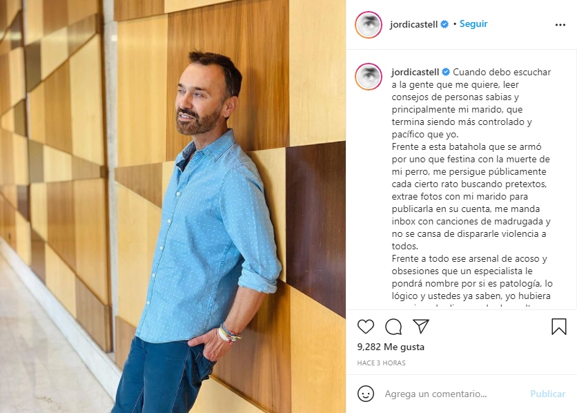 Siguiendo por esta línea, Jordi agregó: «Frente a esta batahola que se armó por uno que festina con la muerte de mi perro, me persigue públicamente cada cierto rato buscando pretextos, extrae fotos con mi marido para publicarla en su cuenta, me manda inbox con canciones de madrugada y no se cansa de dispararle violencia a todos».