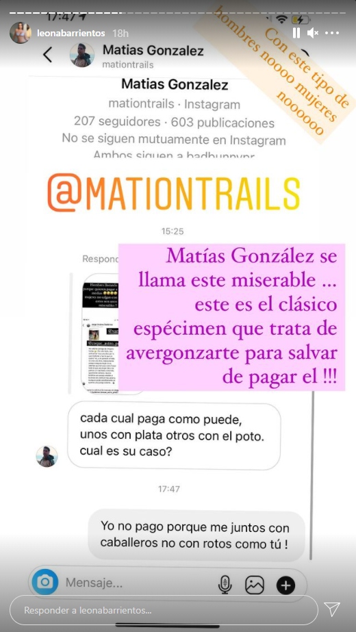 Mientras que otro sujeto no se guardó nada y le escribió sin filtro a Adriana Barrientos: «Cada cual paga como puede, unos con plata otros con el poto, cuál es su caso?». Pero la chiquilla no se quedó callada y lanzó: «Miserable. Este es el clásico espécimen que trata de avergonzarte para salvar de pagar él».