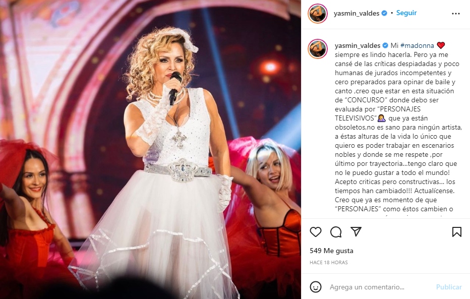 Siguiendo por esta línea, Yasmín Valdés afirmó que «creo que estar en esta situación de ‘CONCURSO’ donde debo ser evaluada por ‘PERSONAJES TELEVISIVOS’ que ya están obsoletos, no es sano para ningún artista, a éstas alturas de la vida lo único que quiero es poder trabajar en escenarios nobles y donde se me respete, por último por trayectoria».