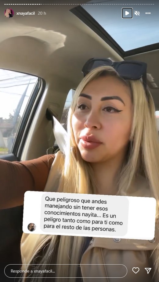 Más tarde, preocupó a sus fans al revelar que aún no sabía como doblar en un semáforo. «Que peligroso que andes manejando sin tener esos conocimientos Nayita», fue un mensaje que compartió la influencer asumiendo la culpa; sin embargo, aseguró que ya ha salido a manejar en diez ocasiones y que ya maneja mejor.