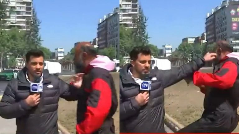 Pero la cosa no se quedó ahí, ya que Simón Oliveros volvió a darle un empujón y el sujeto terminó saliendo entre gritos, mientras empujaba al camarógrafo de Mucho Gusto, para seguir caminando por la calle y golpear al camarógrafo de otro canal.
