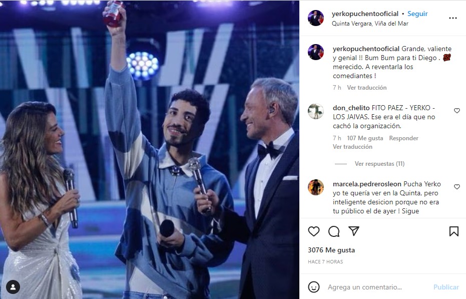 Como era de esperar, al poco tiempo de subir el posteo, Yerko Puchento recibió más de tres mil me gusta y decenas de comentarios, de usuarios que no dudaron en felicitar a Diego Urrutia por su solida rutina, mientras que otros criticaron al humorista por bajarse del Festival de Viña.
