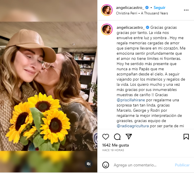 «Gracias gracias gracias por tanto. La vida nos envuelve entre luz y sombra. Hoy me regala memorias cargadas de amor que siempre llevaré en mi corazón. Me emociona sentir profundamente que el amor no tiene límites ni fronteras», comenzó escribiendo la actriz.