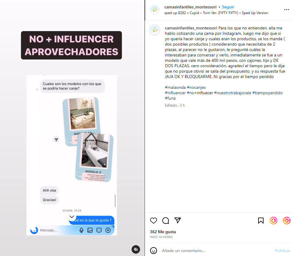 «Para los que no entienden, ella me hablo cotizando una cama por Instagram, luego me dijo que si yo quería hacer canje y cuales eran los productos, se los mande (dos posibles productos) considerando que necesitaba de 2 plazas. Al parecer no le gustaron», comenzaron escribiendo en la cuenta @camasinfantiles_montessori.