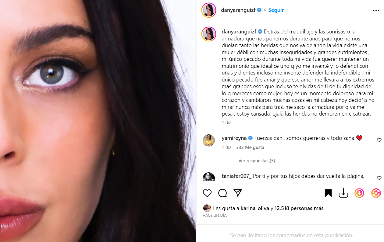 «Hoy es un momento doloroso para mi corazón y cambiaron muchas cosas en mi cabeza hoy decidí a no mirar nunca más para tras, me saco la armadura por q ya me pesa , estoy cansada, ojalá las heridas no demoren en cicatrizar», finalizó.