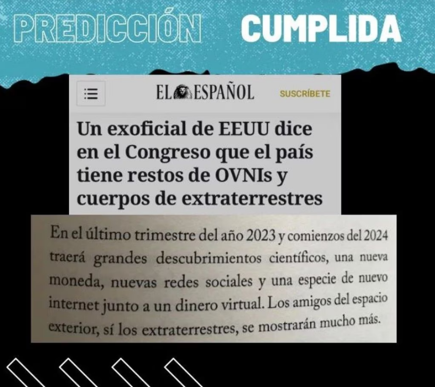 «En el último trimestre del año 2023 y comienzos del 2024, traerá grandes descubrimientos científicos, una nueva moneda, nuevas redes sociales y una especie de nueva internet junto a un dinero virtual», sale expuesto en un fragmento lleno de presagios.