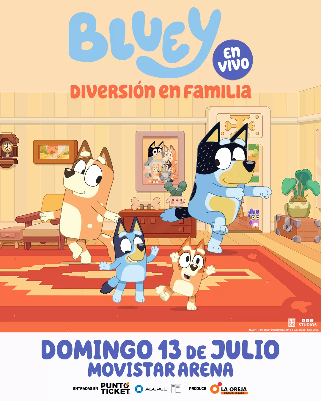 Este domingo 13 de julio a las 17:00 horas, Bluey, Bingo, Muffin, Chilli y Bandit se presentarán por primera vez en el Movistar Arena, en una función única que promete risas, música y mucha emoción.