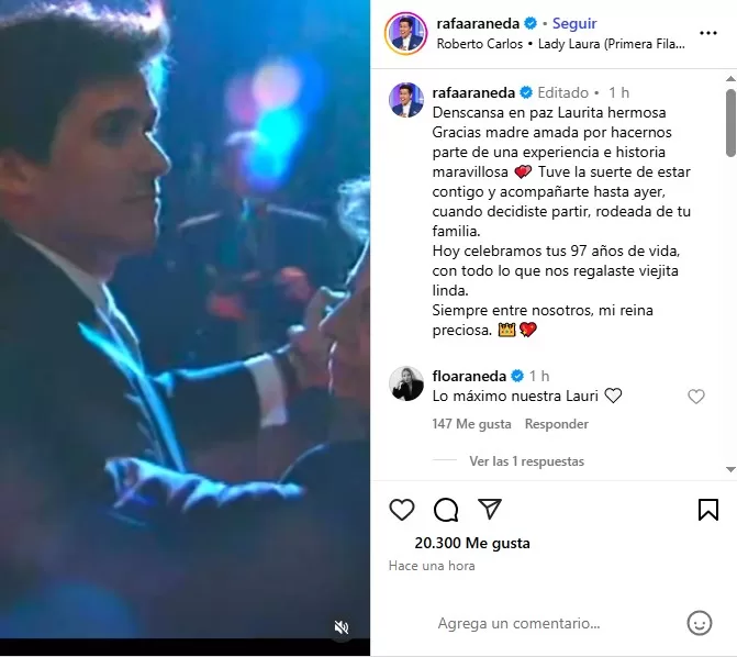 Hace tan solo algunos minutos, Rafael Araneda, confirmó la muerte de su madre, Laura Maturana Guillier, a los 97 años, a través de una emotiva publicación en redes sociales, que acompañó con una serie de registros de su vida.